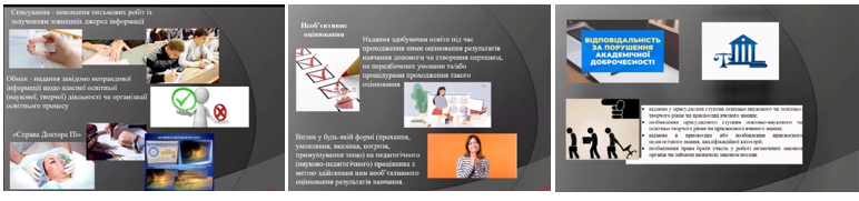 Ольга Біднюк , заступник директора з виховної роботи, закцентувала увагу здобувачів освіти на основних принципах академічної доброчесності, розповіла про найбільш відомі випадки недотримання академічної доброчесності в історії людства, торкнулася питань плагіату, самоплагіату, фальсифікації, списування, хабарництва, необ’єктивного оцінювання тощо. Також, Ольга Святославівна наголосила на академічній відповідальності – це повторне проходження оцінювання (контрольна робота, екзамен, залік тощо); повторне вивчення  відповідного освітнього компонента освітньо-професійної програми; відрахування із закладу освіти (крім осіб, які здобувають загальну середню освіту); позбавлення академічної стипендії.