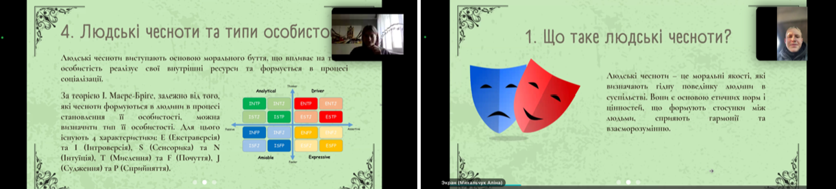 Гончар Юлія, Бабюк Артур та Михальчук Аліна продемонстрували презентацію, присвячену темі: «Людські чесноти та типи особистості».