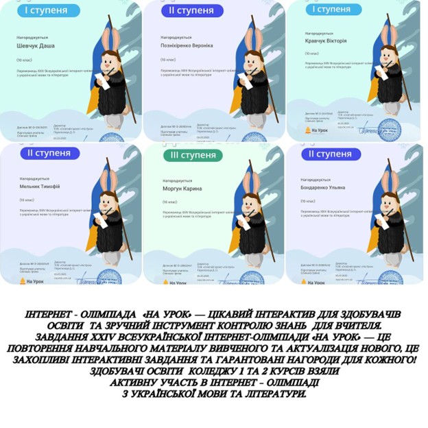 Здобувачі освіти  коледжу 1 курсу взяли активну участь у Всеукраїнській інтернет-олімпіаді на освітній платформі «На Урок» з української мови та літератури.