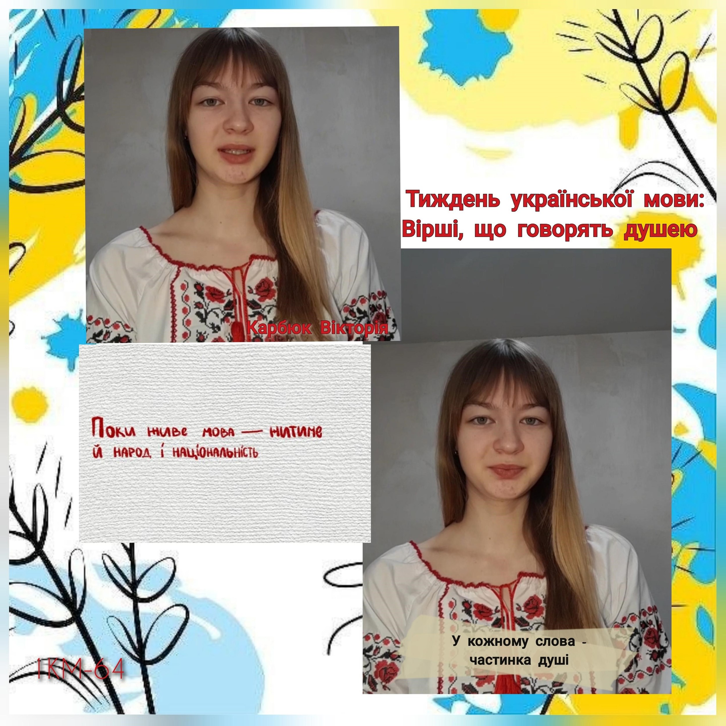 У рамках проведення Тижня української мови та літератури студенти групи 1КМ-64 продекламували вірші українських поетів і поетес про рідну мову. Адже мова - душа народу, її скарб. Поки житиме мова, житиме і наш народ!