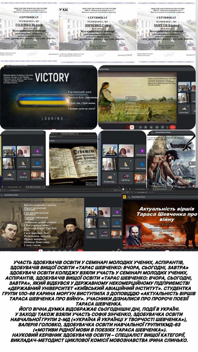 Під такою назвою кафедра української мови, історії та інформаційної діяльності Державного некомерційного підприємства «Державний університет «Київський авіаційний інститут» провела традиційний усеукраїнський науковий семінар молодих учених, аспірантів, здобувачів вищої освіти, який проводиться щорічно в рамках березневих Шевченківських днів.