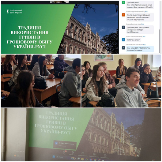16.03.2026 року в рамках тижня фінансово-кредитних дисциплін здобувачі освіти ВСП «ФЕК КНЕУ ім. Вадима Гетьмана», разом із викладачами, Костюченко А. М. та Кожухар Н.М. взяли участь у вебінарі «Традиція використання гривні в грошовому обігу України», який проводився Національним банком України спільно з партнерами в рамках Всесвітнього тижня грошей 2026 (англ. Global Money Week 2026).