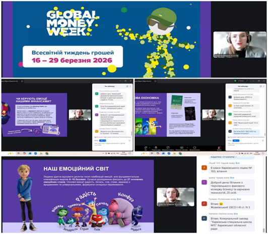 16.03.2026 року в рамках тижня фінансово-кредитних дисциплін здобувачі освіти ВСП «ФЕК КНЕУ ім. Вадима Гетьмана», разом із викладачами, Костюченко А. М. та Кожухар Н.М. взяли участь у вебінарі від головної експертки управління зв’язків з громадськістю Департаменту комунікацій Національного банку України Костів Марти-Марії на тему: «Фінанси на емоціях: хто керує твоїми фінансовими рішеннями?». Для учнів старших класів та студентів.