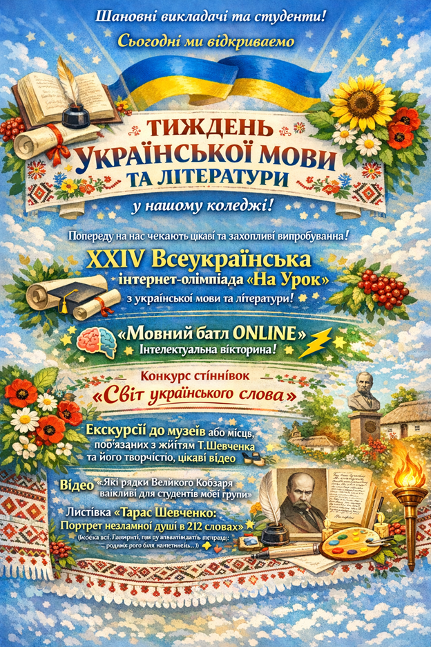 У коледжі розпочинається Тиждень української мови та літератури — особлива подія, що об’єднує студентів і викладачів навколо любові до рідного слова, української культури та національних традицій. Українська мова — це не лише засіб спілкування, а й духовний код нашого народу, джерело історичної пам’яті, сили та єдності.